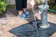 Fill the basin with water then install the lid. To ensure the pump flow control is set appropriately and the water is flowing back into the basin, place the fountain unit in its final location adjusting as needed using the pad sheets, and plug in the pump. Check for leaks and adjust accordingly, then backfill the hole with dirt.